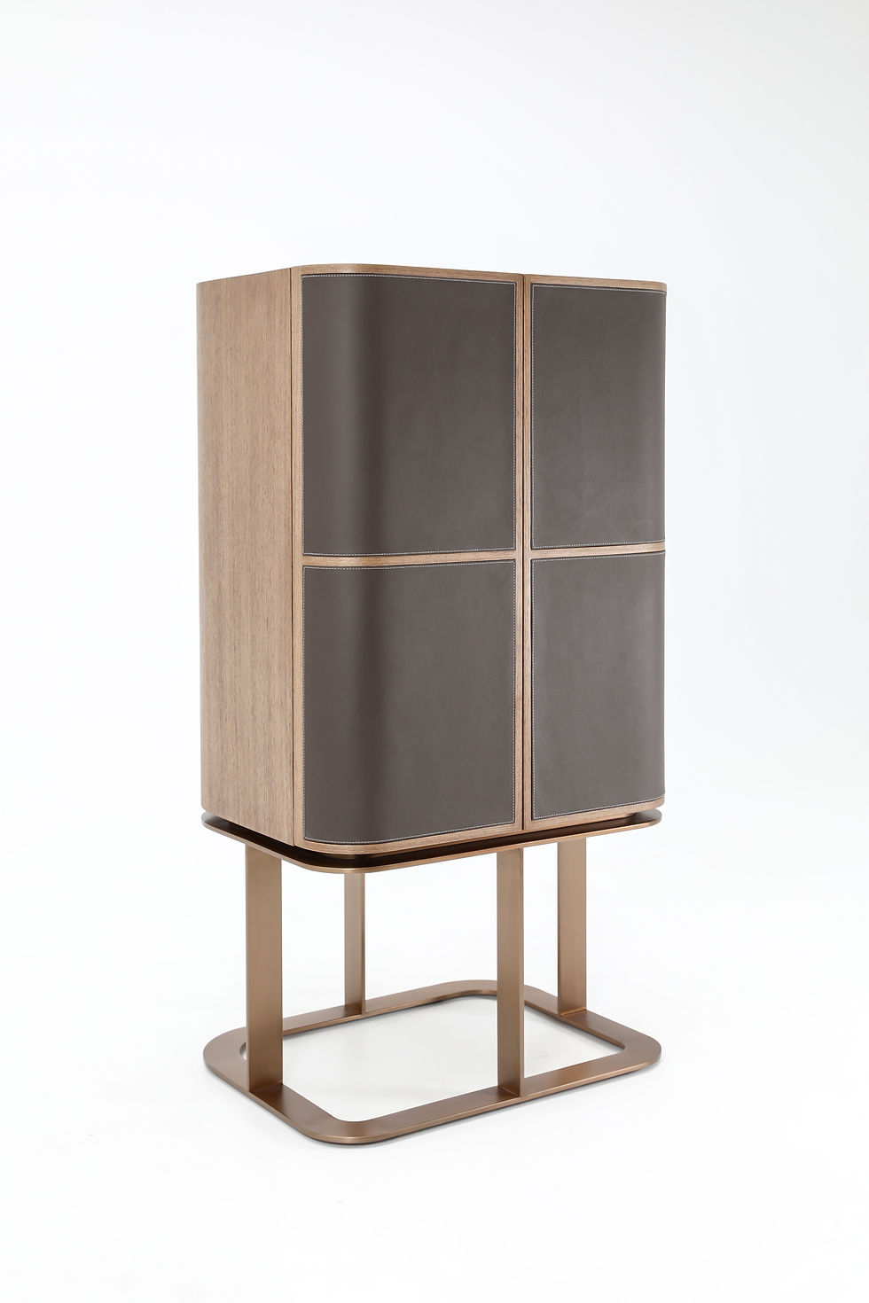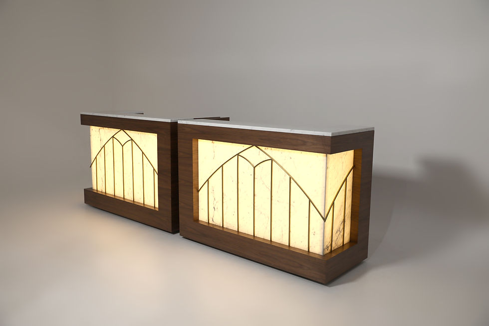 The London mini-bar is made from oak wood and is decorated with beautiful backlit marble and a stainless steel work area, a mixture of square form and material that can adapt to any type of environment and transform any space into a social and friendly place.
